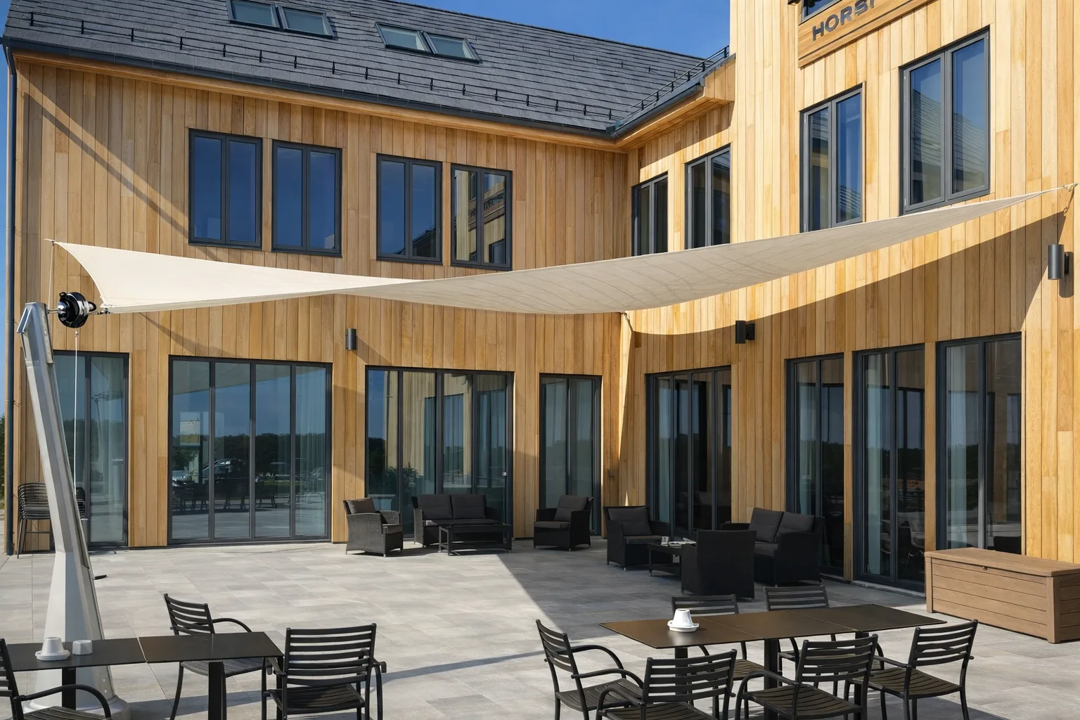 Den här lösningen visas separat eftersom den bygger på en öppningsbart 100% vattentätt pergolamarkis för pergolor, i stället för en fast segelduk. Den passar projekt där du vill kunna dra undan duken och variera skuggningen över dagen.